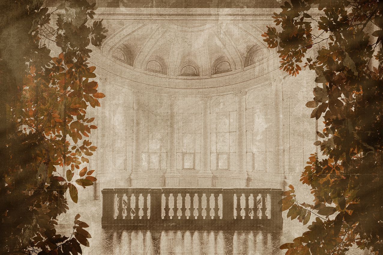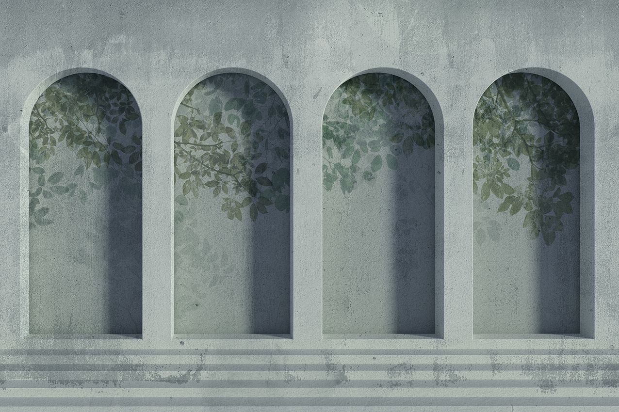 Step into a world of grandeur with a mural featuring an immense Roman architectural interior, complete with a large glass window framing the view. On either side of the balcony railing, the branches and leaves of towering trees bring nature's beauty right to your doorstep. This design combines the timeless elegance of classical architecture with the refreshing tranquility of nature, creating a sophisticated yet serene atmosphere in any room. Perfect for those who appreciate both historical beauty and the calming influence of the outdoors.