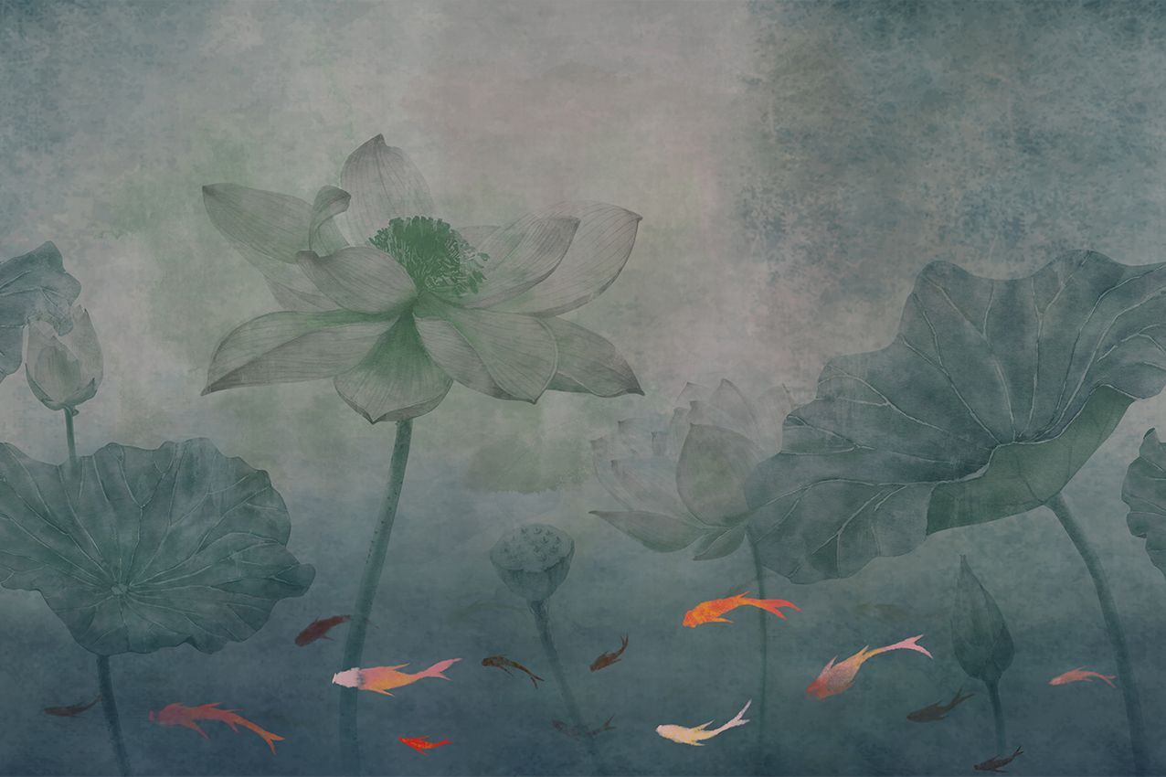 Bring the serene beauty of nature into your space with a mural featuring a magnificent bloom of giant lotus flowers, their petals unfolding in full splendor. Beneath the leaves, a golden school of fish swims gracefully, adding a touch of life and movement to the tranquil scene. This mural combines elegance, vibrancy, and peaceful energy, perfect for creating a harmonious, nature-inspired atmosphere in any room.