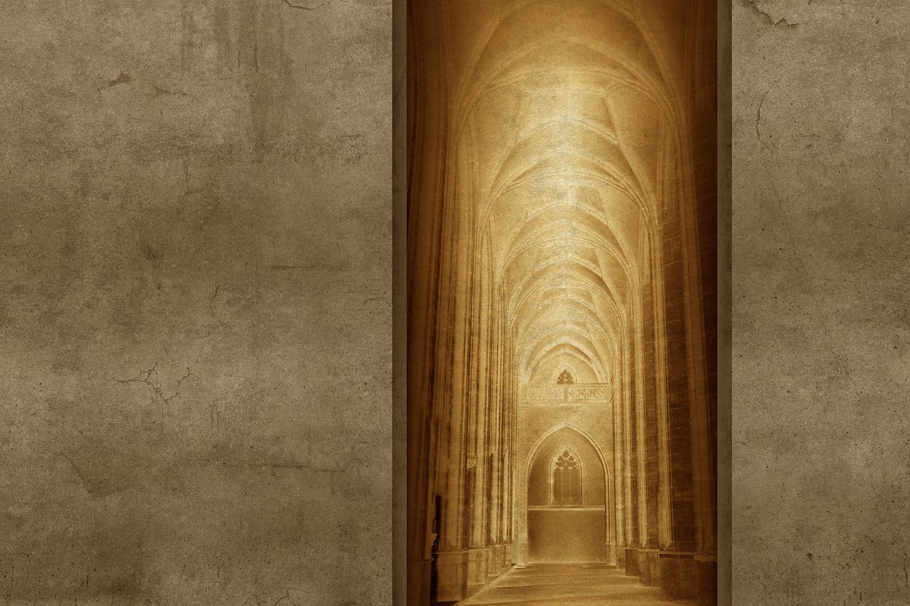 Create a dramatic and awe-inspiring atmosphere with a mural featuring two grand rows of towering church columns, bathed in a beam of light that breaks through the space. The interplay of light and shadow highlights the architectural magnificence, evoking a sense of reverence and timeless beauty. Perfect for adding depth, elegance, and a touch of sacred grandeur to any room, this mural brings both spiritual and artistic richness to your space.