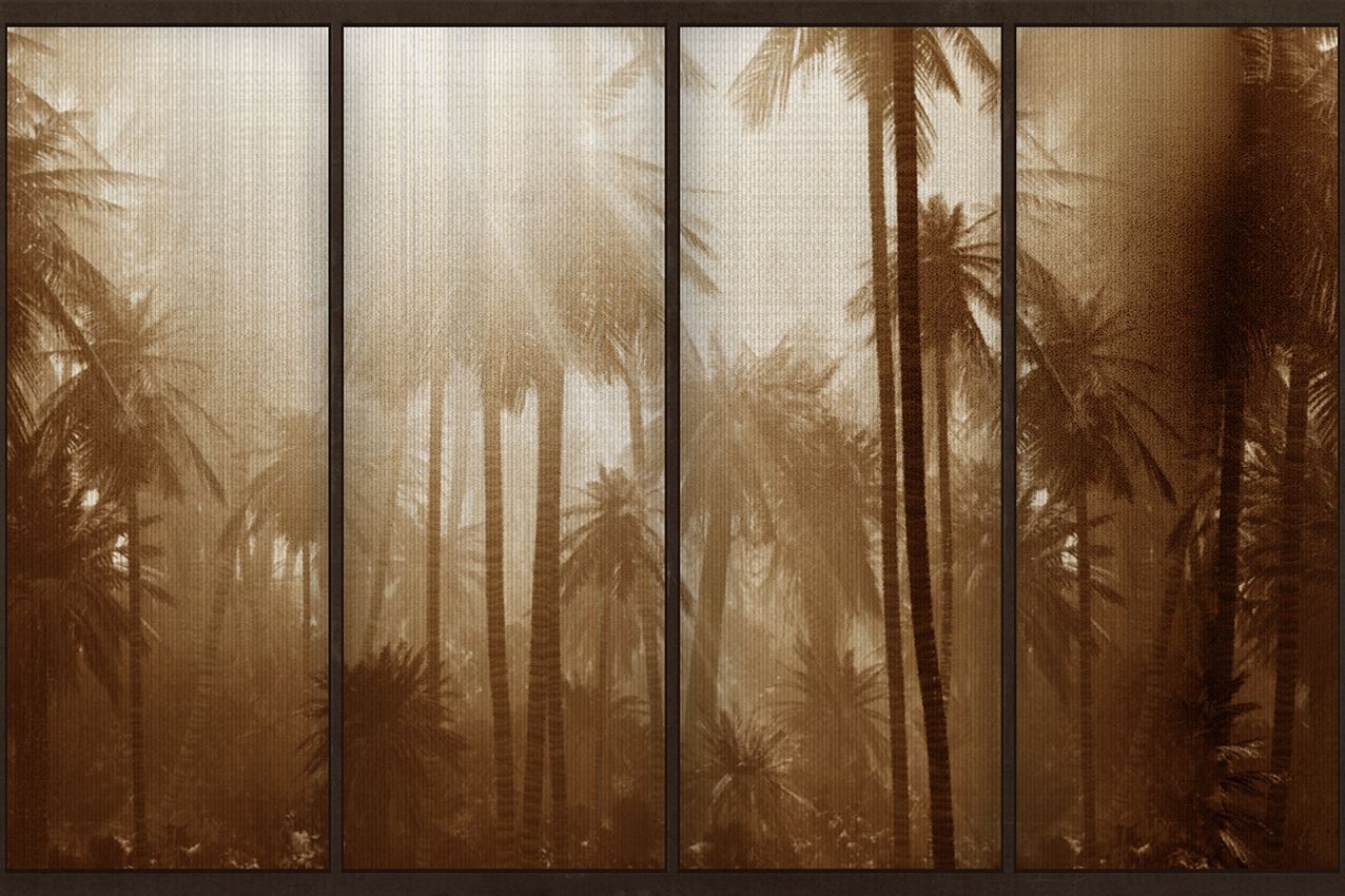 Invite the beauty of the outdoors into your space with a mural that captures the view through a glass window, where a lush group of palm trees stands tall against the backdrop of soft, filtered light. The gentle sunlight streaming through the glass adds warmth and depth to the scene, creating a peaceful, tropical atmosphere. Perfect for bringing the tranquility of nature indoors, this mural infuses any room with light, serenity, and the refreshing energy of palm-lined landscapes.