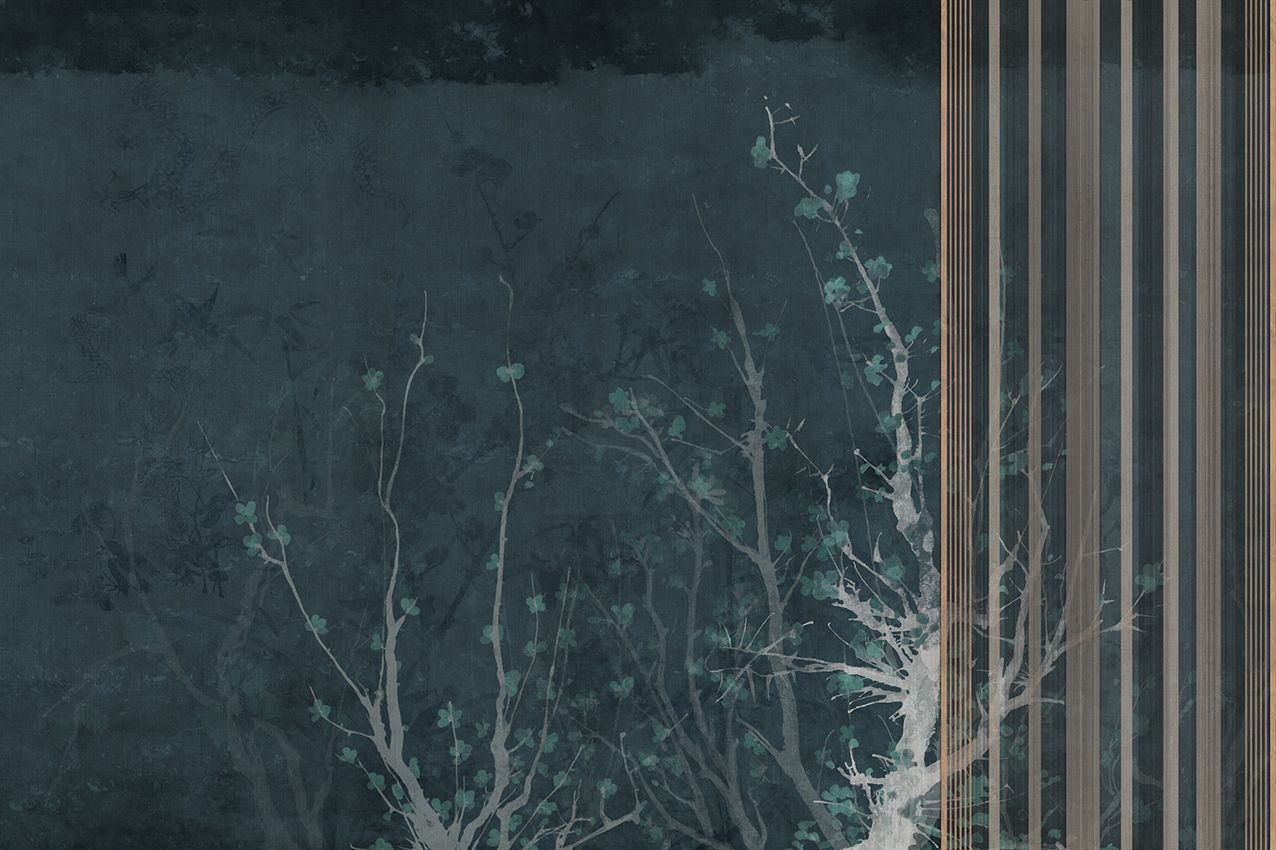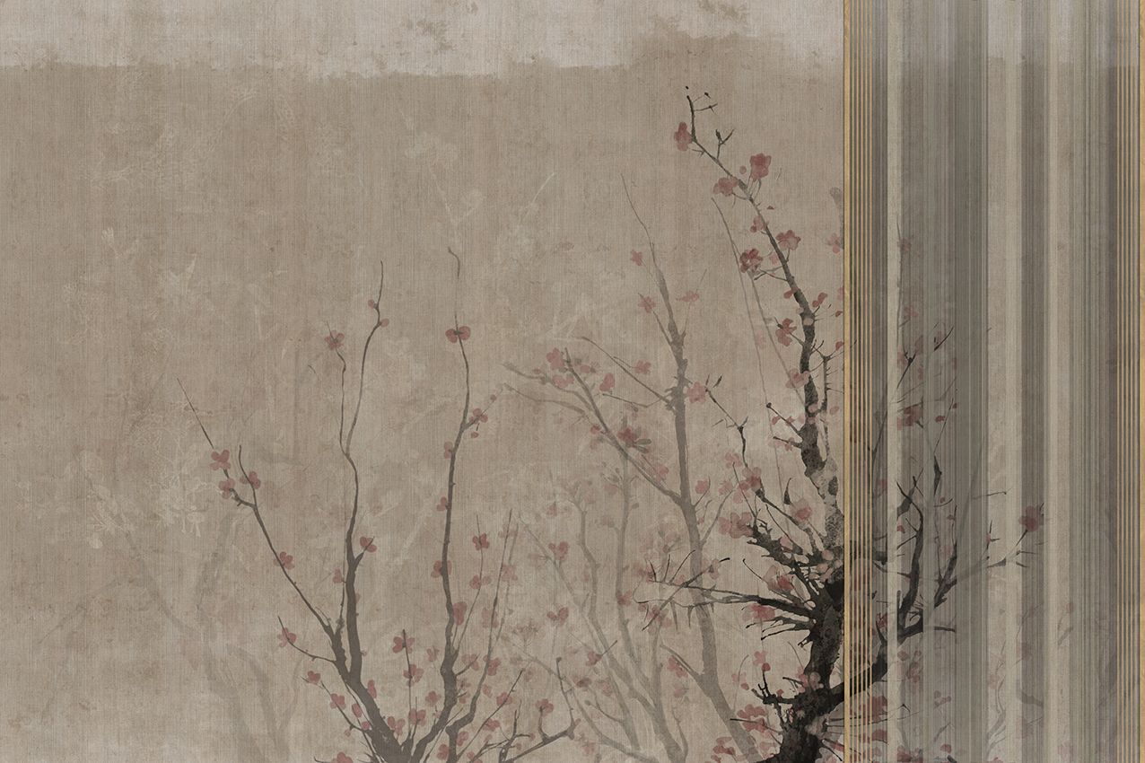 Infuse your space with the elegance of Eastern beauty through a mural featuring delicate plum blossoms and branches, layered over a textured backdrop that enhances its depth and richness. Vertical wooden lines, expertly placed according to the golden ratio, guide the eye and bring a harmonious balance to the scene. This design combines traditional Chinese aesthetics with modern precision, creating a refined, serene atmosphere perfect for adding cultural sophistication and natural elegance to any room.