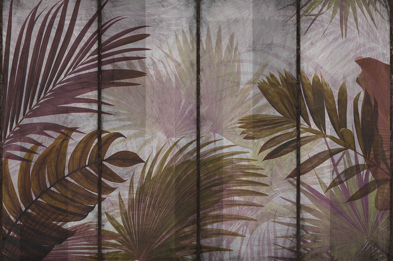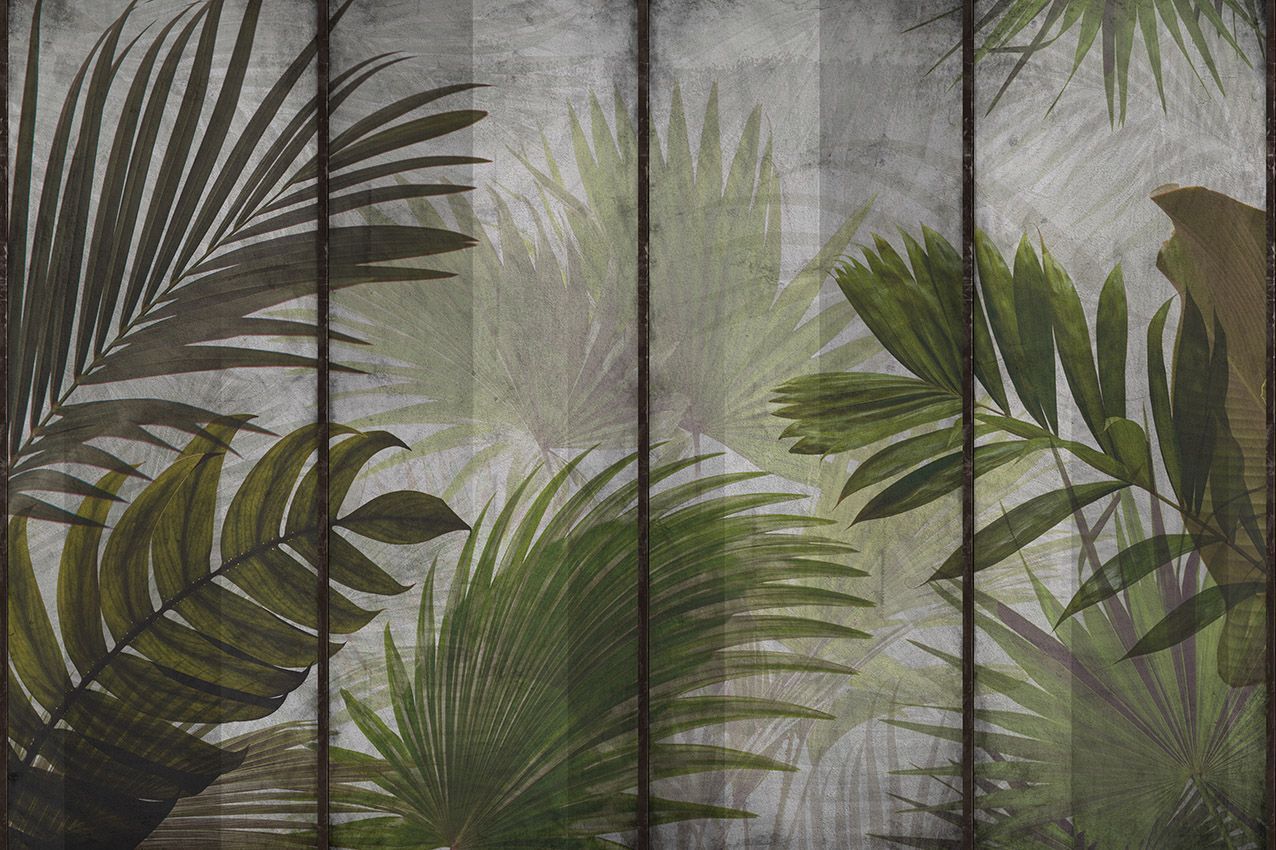 Bring the lush beauty of the tropics into your space with a mural featuring overlapping tropical palm leaves, creating a rich, layered effect. The foreground is enhanced by metallic panels, giving the design a modern, sculptural feel as if each panel is individually placed, showcasing the vibrant foliage. This fusion of tropical elegance and metallic sophistication adds depth, texture, and a striking visual impact, perfect for creating a dynamic and stylish atmosphere in any room.