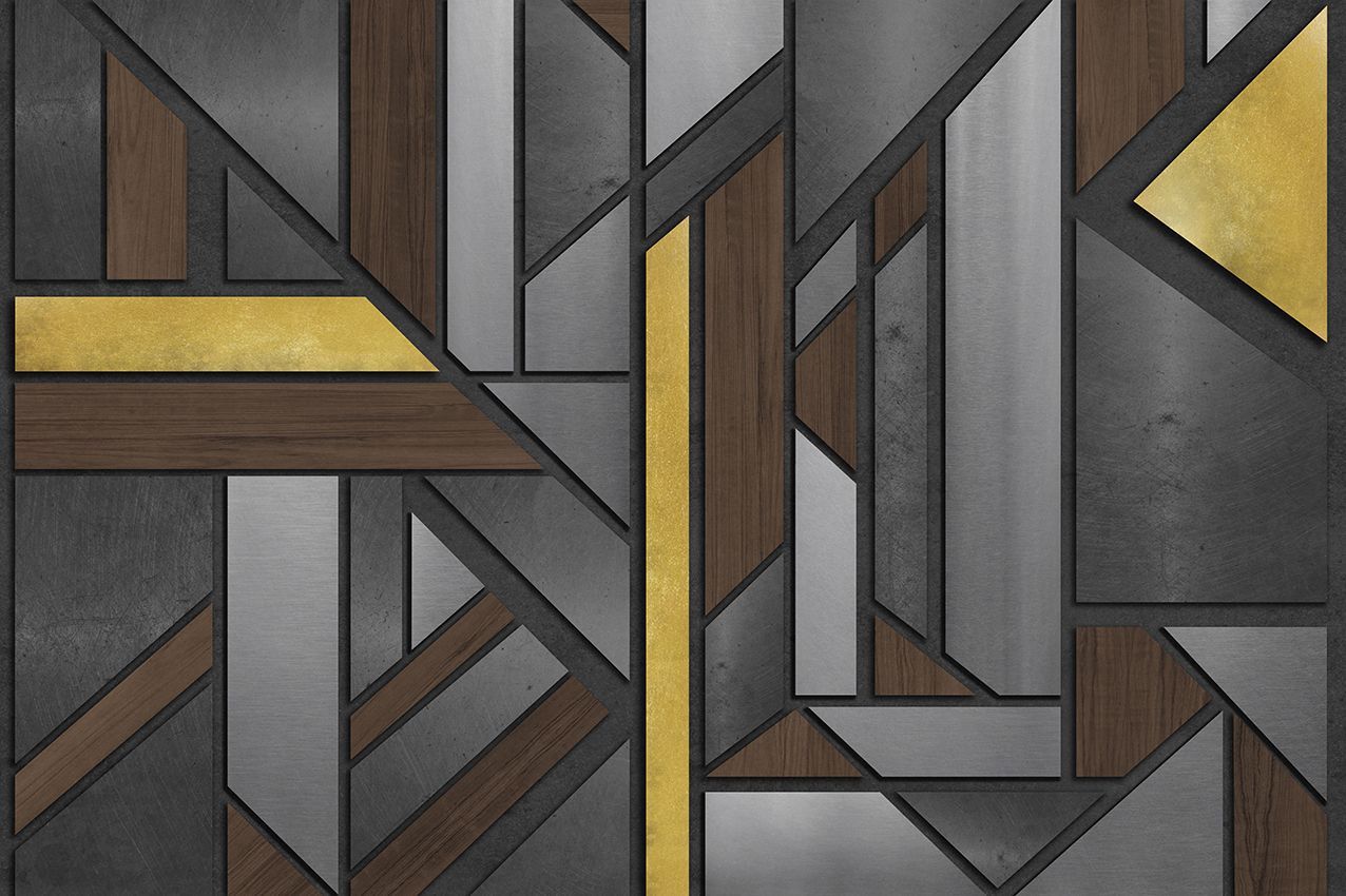Add a touch of modern sophistication with a mural featuring metallic-colored blocks, divided by recessed lines that create a sense of depth and structure. Accentuated by bold, contrasting color blocks, this design combines sleek, industrial textures with vibrant pops of color, making it a striking focal point in any room. Perfect for those seeking a contemporary, dynamic look, this mural brings a refined yet bold energy to your space.