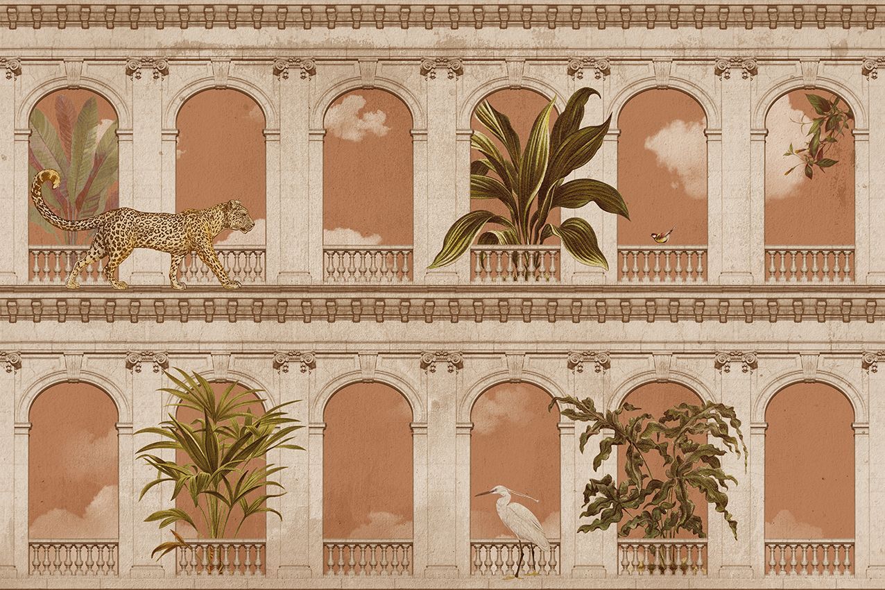 Transport your space to a realm of timeless elegance with a mural featuring a soft, neutral background adorned with floating white clouds. In the foreground, two rows of majestic Roman columns rise, intricately detailed with ancient tropical plants, while a graceful leopard moves along the columns, adding a touch of wild beauty. This design blends classical architecture with the exotic allure of nature, creating a stunning fusion of history, wildlife, and sophistication. Perfect for adding depth, drama, and cultural richness to any room.