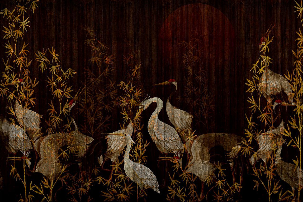 Enhance your space with a mural that combines the natural texture of wood grain with a dark, vintage finish, featuring elegant bamboo and graceful cranes. The weathered effect brings a sense of history and depth, while the bamboo and cranes evoke tranquility and timeless beauty, drawing on traditional Eastern symbolism. Perfect for creating a serene, culturally rich atmosphere, this mural adds warmth, sophistication, and a touch of nature to any room.