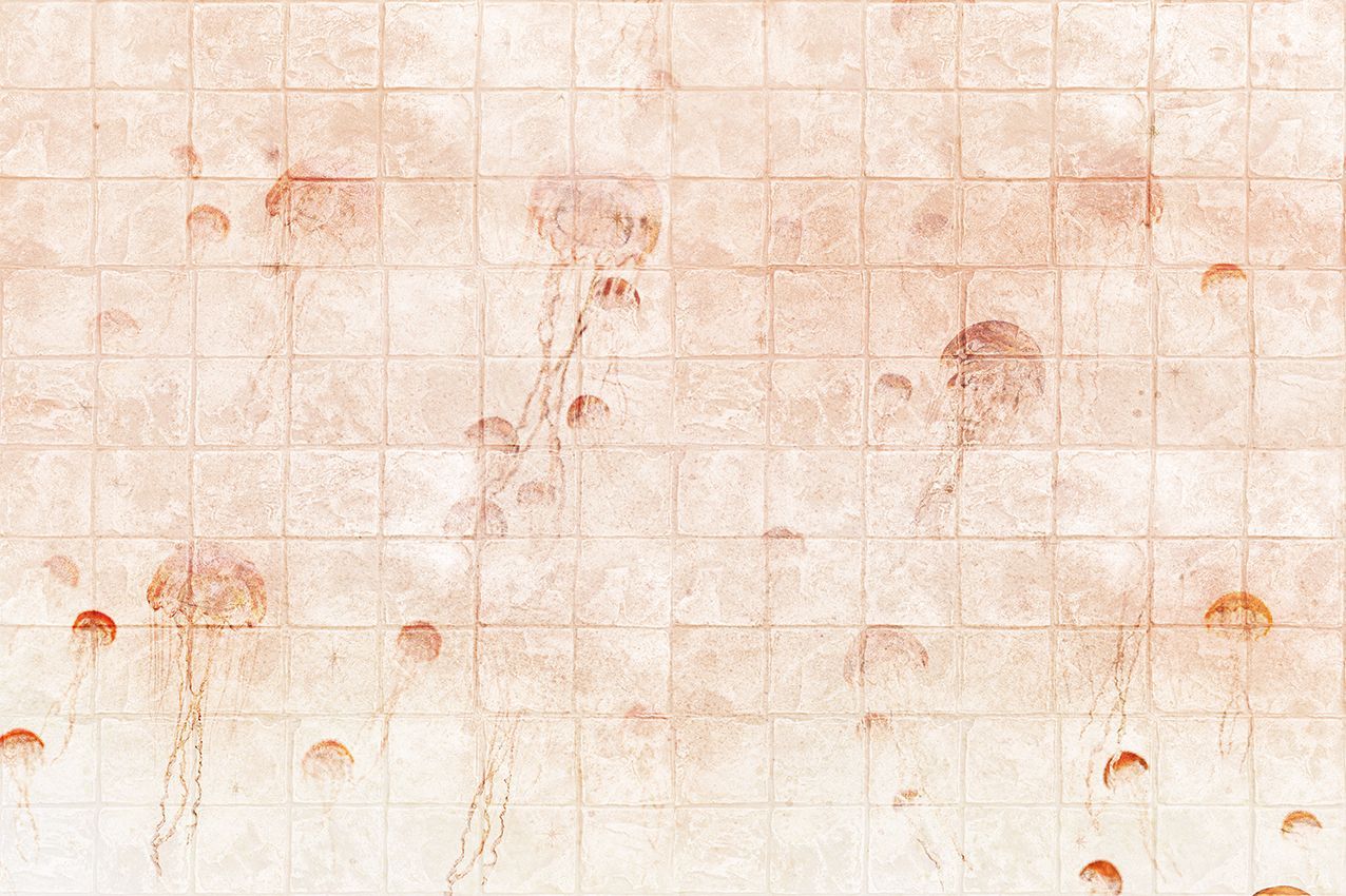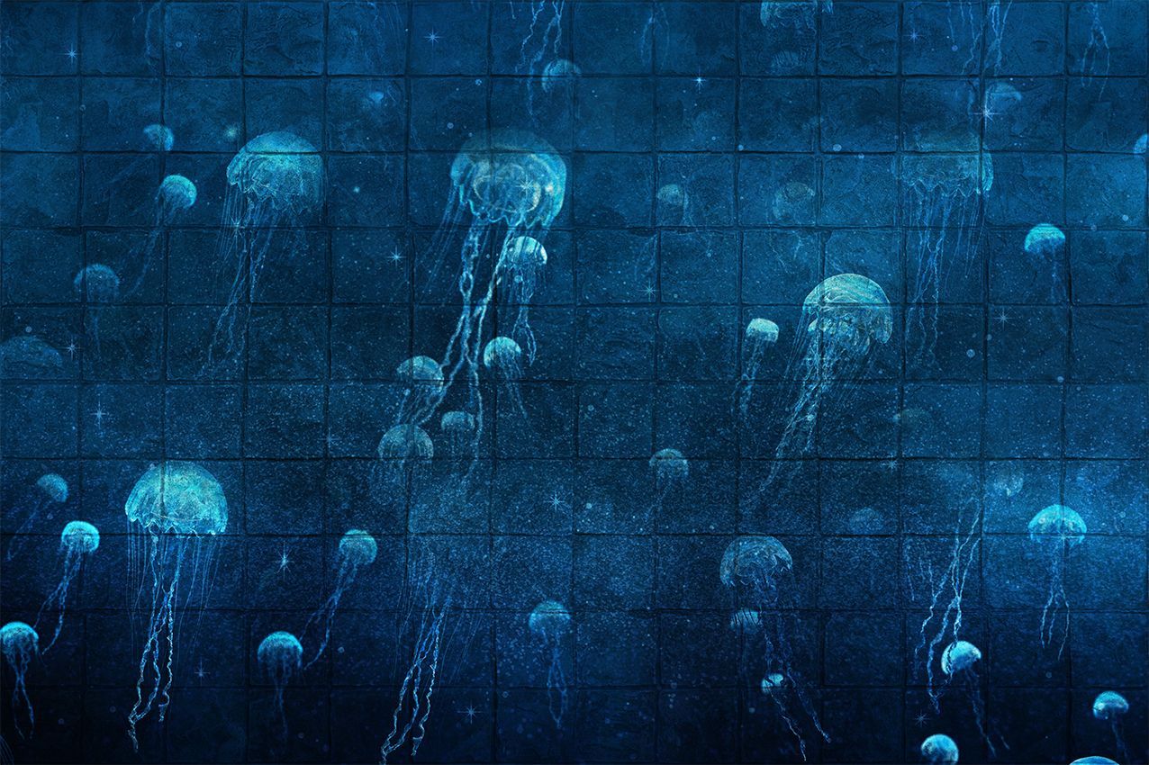 Transform your space with a captivating mural featuring a porcelain-patterned backdrop, blending seamlessly into the deep, oceanic hues beneath. Graceful jellyfish drift across the design, creating a mesmerizing underwater scene. This mural brings the tranquil beauty of the sea into your room, combining delicate artistry with the serene movement of marine life, perfect for creating a calm, ethereal atmosphere in any space.