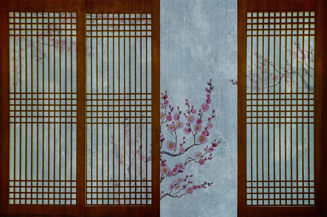 Bring the elegance of traditional Chinese design to your space with a mural featuring blooming plum tree branches, layered over a richly textured backdrop. At the top, a classic wooden frame adds a touch of architectural charm, framing the natural beauty of the flowers. This design blends the timeless grace of nature with cultural sophistication, perfect for adding a serene, refined atmosphere to any room. Ideal for those who appreciate the art of nature and traditional craftsmanship, this mural creates a peaceful and inviting ambiance.