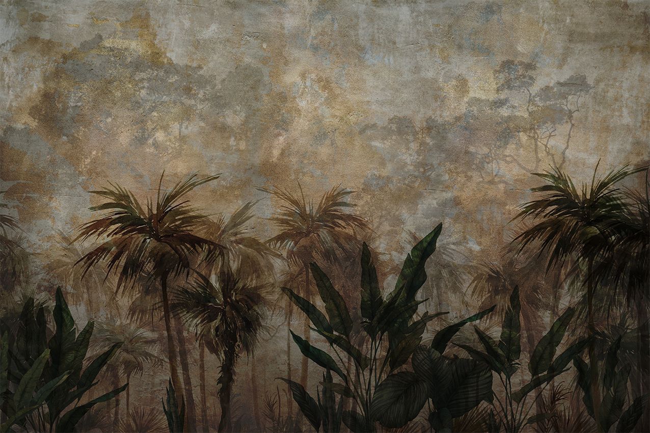 Bring the calming beauty of the tropics into your space with a mural featuring a soft, layered tropical rainforest backdrop. The gentle hues of warm yellows, blues, and greys create a serene, sophisticated atmosphere, evoking the peaceful essence of a rainforest bathed in soft light. This design adds depth and warmth to any room, perfect for creating a tranquil, nature-inspired environment with a modern, refined twist.